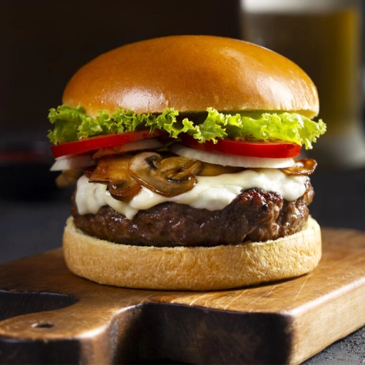 Pão, bife artesanal, batata, milho, queijo, bacon, alface e tomate